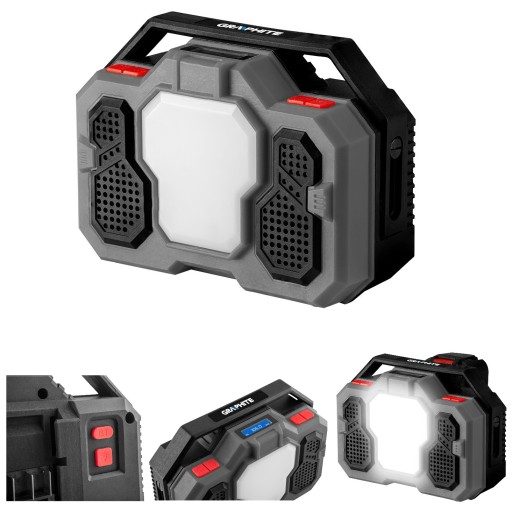 Radio posiada dwa głośniki o mocy 3 W każdy, wyświetlacz LCD, funkcję FM (87,5 – 108 mHz) oraz bluetooth, lampę LED 15 W o mocy 21 W, składaną antenę, gwint do zamocowania oraz 3 letnią gwarancję od marki GRAPHITE.