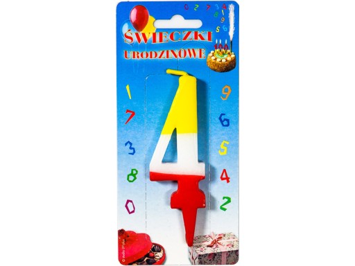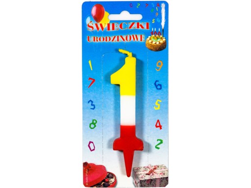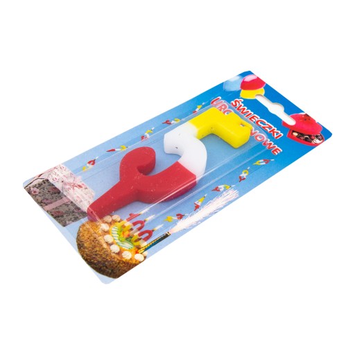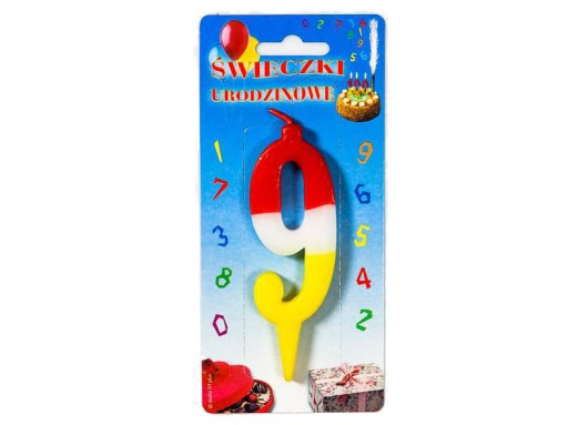 Świeczka urodzinowa w kształcie trójkolorowej cyferki.