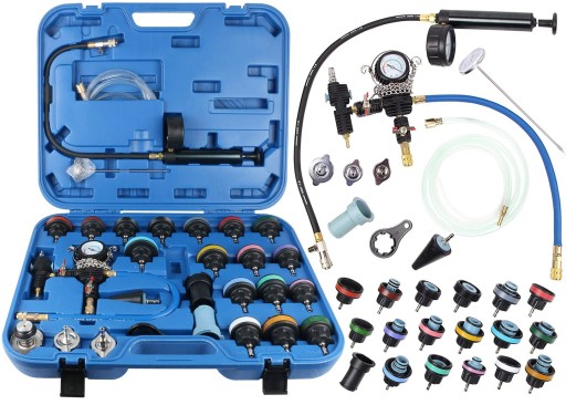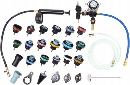 27-elementowy zestaw do testowania przecieków w chłodnicy, a tak że dokonania szybkiej zmiany chłodziwa. Oznaczone różnymi kolorami nakrętki ułatwiają wybór odpowiedniego korka testowego.