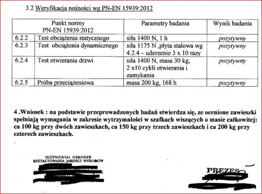 - Konstrukcja zawieszki gwarantuje wytrzymałość zawieszenia szafki przy jej obciążeniu nawet do 500 kg pod warunkiem odpowiednio mocnego zamocowania odpowiedniej listwy montażowej na której zawieszona jest szafka i solidnej konstrukcji szafki, niemniej jednak zawieszka posiada atest załączony poniżej na obciążenia do 200kg