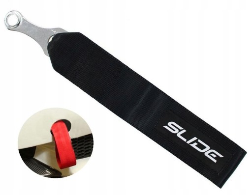 Materiałowy zaczep holowniczy. Według nas z przeznaczeniem bardziej jako gadżetu lub doraźnym użyciem aniżeli do regularnego praktycznego zastosowania.