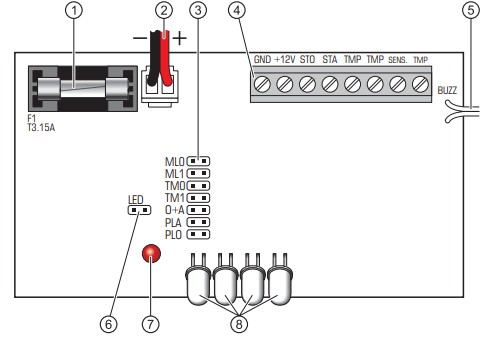6 - kołki do włączania/wyłączania sygnalizacji obecności zasilania zewnętrznego. Sygnalizacja jest