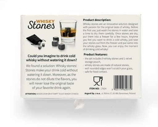 Kamienie do whisky - zupełna nowość na rynku - gadżet dla wymagających klientów, w szczególności dla koneserów whisky. Ten zestaw 9 specjalnych kamieni zastępuje kostki lodu. Kostki należy umieścić na minimum 4 godziny w zamrażalniku, aby uzyskały pożądaną temperaturę. Po wyjęciu można ich użyć zamiast kostek lodu. Najważniejsze zalety tego rozwiązania w porównaniu do kostek lodu to: nie rozcieńczają napoju, można je wykorzystać wielokrotnie, są niezwykle oryginalne. Kostki wykonane są z naturalnego bazaltu. Produkt posiada atest dopuszczający do kontaktu z żywnością. Przy zakupie powyżej 5 sztuk możliwość wykonania znakowania - grawerowanie - za dodatkową opłatą. Logo - wielość na kamieniach 15/15 mm. Preferujemy formaty logo lub innych danych ( cdr, Pdf).