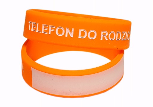 Pomarańczowa silikonowa opaska dla dziecka z miejscem na napis telefonu rodzica. Rozmiar 14cm.