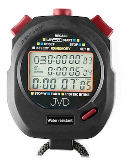 Stoper JVD ST3860. Dokładność 1/100 s. Zakres pomiaru do 10 godzin. Pamięć 60 okrążeń / międzyczasów. Timer. Metronom. Zegar, alarm, kalendarz, termometr. Obudowa z tworzywa sztucznego odporna na zachlapania