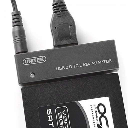 Podłącz dysk SATA przez port USB Adapter Y-1039 umożliwia podłączeniu dysku SATA 2,5" lub 3,5" bezpośrednio do portu USB komputera lub innego urządzenia IT/RTV. Zastosowanie jego jest wszechstronne: do szybkiego backupu, w celach serwisowych, możesz podłączyć dysk do rutera i ściągać filmy lub gry z Internetu. Y-1039 pracuje nie tylko z dyskami HDD lub SSD, w podobny sposób możesz podłączyć również nagrywarki lub odtwarzacze z wyjściem SATA. Główną jego zaletą jest prostota i szybkość podłączenia. Szybki transfer danych Technologia USB 3.0 w połączeniu z interfasem SATA III pozwala na osiągnięcie szybkiego transferu danych - do 5 Gbps. W zestawie znajdziemy zasilacz, który będzie potrzebny przy podłączaniu dysków talerzowych i innych urządzeń, które dla prawidłowej pracy potrzebują więcej prądu. Funkcja Sleep Mode wyłączająca twardy dysk po 30 minutach bezczynności oszczędza prąd i zwiększa żywotność dysku. Dioda LED sygnalizują transfer danych.