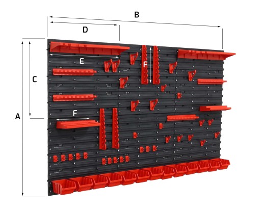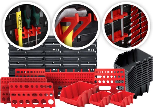 Niezwykle praktyczne zestawy, wyposażone w kubeczki na elementy drobnicowe oraz uchwyty i wieszaki, pozwolą zachować przejrzystość i ład w akcesoriach narzędziowych i magazynowych. Tablice posiadają otwory montażowe, zapewniające szybki i łatwy montaż na ścianie.