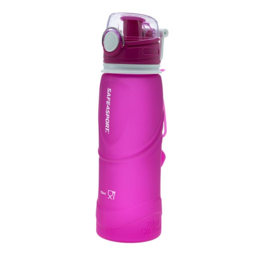 Silikonowa składana butelka Safe4sport jest bardzo praktyczna. Posiada szeroki otwór umożliwiający łatwe nalanie nawet gorącego napoju. Wyposażona jest w solidny uchwyt oraz pasek służący do jej składania. Ustnik butelki wyposażony jest w blokadę zapobiegającą wyciekowi wody ze środka oraz zawór odpowietrzający. Całość zabezpieczona jest praktyczną pokrywką dzięki której ustnik jest zawsze czysty i higieniczny.