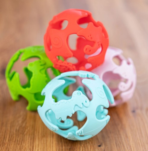Mięciutka piłeczka, ozdobiona dinozaurami, zachwyci każdego malucha! Wykonana z bezpiecznego silikonu jest odporna na zgniatanie, a znajdujące się w niej otwory ułatwią małym rączkom chwytanie zabawki. Wypustki o różnych kształtach przyniosą ulgę obolałym dziąsłom ząbkującego dziecka. Piłeczka dostępna jest w kilku kolorach.