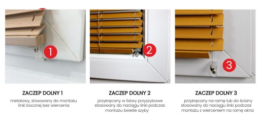 - Zaczepy belki dolnej, wpięcie na click przykręcany do ramy + 15 zł | kpl. (tańsza wersja podtrzymująca żaluzję przy ramie, wpinamy gdy żaluzja jest całkowicie rozwinięta)