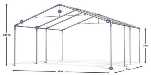 1 - Dach PE (polietylen) 240g/m2 2 - Brama typu kurtyna 3 - Mocne zamki YKK przy wjazdach 4 - Wymienne maskownice 5 - Ściany boczne PE ok. 2 x 2 m (polietylen) 240g/m2 6 - Oczka mocujące plandekę