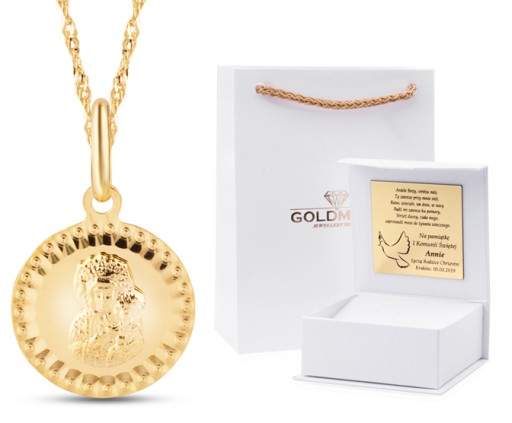 Złoty komplet, medalik z łańcuszkiem w całości wykonane ze złota próby 333. Zestaw idealnie nadaje się na takie okazje jak Chrzest Święty lub Komunia Święta. Dzięki bezpłatnemu grawerunkowi prezent stanie się jeszcze bardziej indywidualny. Biżuteria oferowana przez nas jest najwyższej jakości. Zdjęcia są naszego autorstwa, przedstawiają dokładnie ten produkt, który kupujesz! Do każdego zakupu otrzymasz gratis wybrane pudełko wraz z grawerunkiem. Możliwość wykonania dedykowanego napisu na wybranych medalikach.