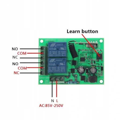 - włącz / wyłącz (naciśniecie przycisku nr 1 w pilocie powoduje włączenie przekaźnika nr 1 w odbiorniku a kolejne naciśniecie przycisku nr 1 w pilocie spowoduje wyłączenie tego przekaźnika). Analogicznie działa kanał drugi.