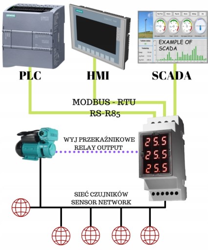 - Zastosowanie konfigurowalnego wyjścia przekaźnikowego umożliwia sterowanie innymi urządzeniami np. pompą wody.