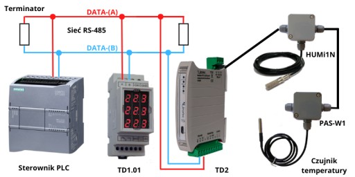 Moduł pomiaru temperatury TD1.01 – Mierzy temperaturę z wielu punktów pomiarowych, umieszczonych na wspólnej magistrali, na protokół Modbus-RTU. Jest to przetwornik temperatury na MODBUS umożliwiając zdalny odczyt ich wartości wspomnianym protokołem przez port RS-485.