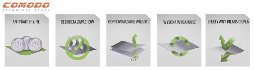 Dodatkowo dla wzmocnienia i komfortu skarpety posiadają płaski szew oraz strefy wykonane z pogrubionego materiału: