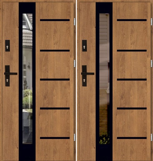 Drzwi wykonane zostały z blachy pokrytej folia dekoracyjną PCV co sprawia, że idealnie pasującą do stolarki okiennej.
