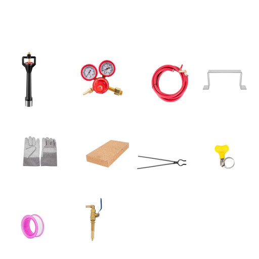 W zestawie akcesoria: para rękawic odpornych na wysokie temperatury, kombinerki, wąż gazowy, regulator ciśnienia gazu, cegła szamotowa, rama nośna, palnik, dwa dławiki itp. Kowalstwo można od razu rozpocząć !
