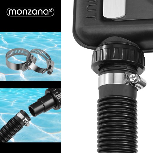 Dzięki temu wydłuża się czas przebywania wody w kolektorze słonecznym. W ten sposób woda w basenie szybciej się nagrzewa. Adapter 2 w 1 można podłączyć węże o średnicy od 32 do 38 mm.