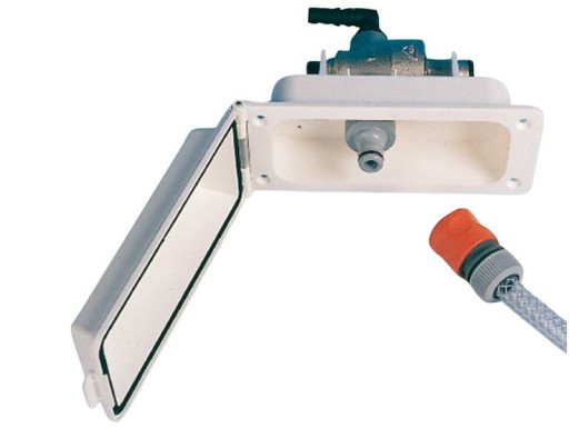 Gniazdo przyłącze zewnętrzne wody z reduktorem ciśnienia renomowanej firmy Comet. W zestawie z szybko złączką, którą można założyć na zwykłego węża wodnego. Idealnie nadaje się do zastosowania w przyczepie kempingowej lub kamperze. Dzięki temu gniazdu, możemy w prosty sposób tankować zbiornik czystej wody prosto z publicznej sieci wodociągowej. Wbudowany reduktor, redukuje ciśnienie z sieci wodociągowej 10 bar do ciśnienia 1,4 bar, które jest bezpieczne dla instalacji w przyczepie.