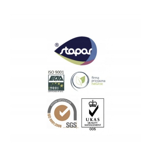- produkty Stapar posiadają certyfikaty ISO 9001 ISO 14001, Europejski Certyfikat Jakości® oraz Atesty PZH