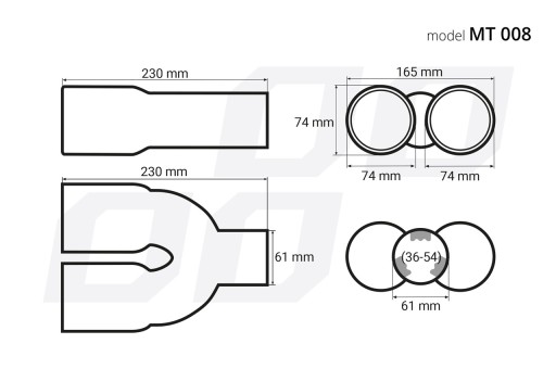 - Średnica montażowa: 36 - 54 mm (średnica oryginalnej rury wydechowej, na którą można zamontować końcówkę)