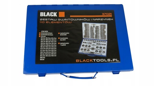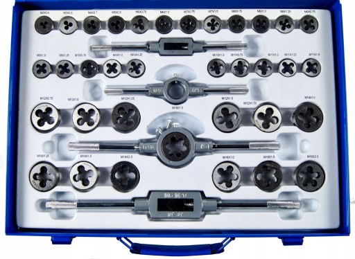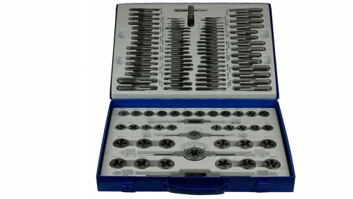 Gwintowniki i narzynki wykonane z doskonałego materiału. Zestaw zawiera 110 elementów. Zapakowany jest w wygodną walizkę, która pozawala utrzymać porządek, łatwo transportować i błyskawicznie odnaleźć potrzebny w danej chwili element.