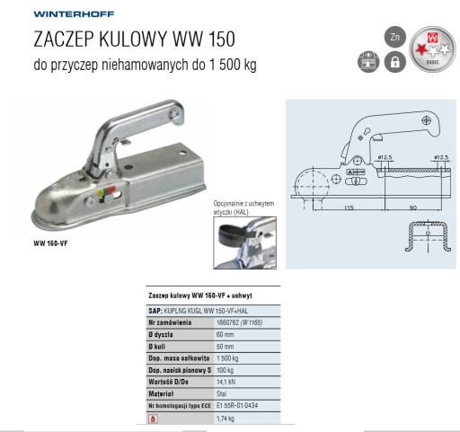 WINTERHOFF ШАРОВАЯ СЦЕПКА 1500кг КВАДРАТНЫЙ крючок 60мм