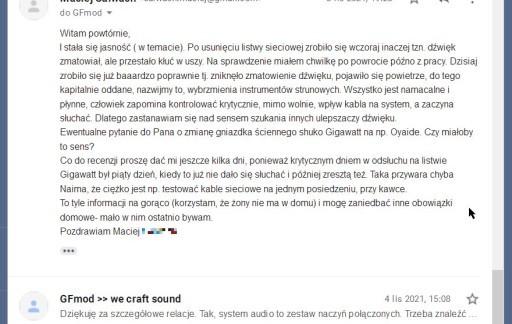 "Spełniając obietnicę wystawiam opinie kablowi zasilającemu GFmod Advanced. Do tej pory za zasilanie mojego sprzętu odpowiadał set Furutech (FP-3TS20 i 3TS762 ) jako w moim odczuciu sweet spot kablarski w sensie jakości do ceny bez jakichś szaleństw. Dostałem do niezobowiązującego odsłuchu wspomnianą sieciówkę GFmod jeszcze poprzednią wersję. Nie spodziewałem się że kabel ponad dwa razy tańszy może coś tu wielkiego pokazać, ale ciekawość zwyciężyła :-)
