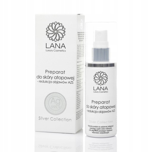Preparat do skóry atopowej LANA Luxury Cosmetics na bazie Srebra Ag 999,99 o stężeniu 50ppm – to dermokosmetyk stworzony w 100% ze składników pochodzenia naturalnego; obszerne właściwości srebra pozwoliły stworzyć produkt dedykowany osobom zmagającym się z atopowym zapaleniem skóry (AZS), pokrzywką i wypryskiem alergicznym.