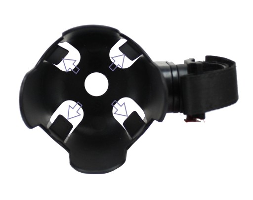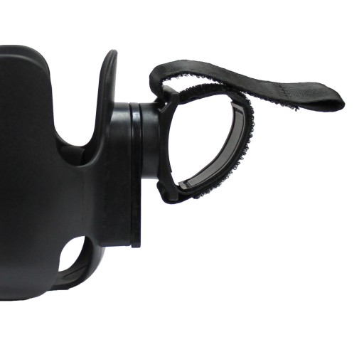 Obrotowy 360°, gwarantuje możliwość przypięcia w różnych miejsach na wózku i przesuwania, ustawiania go w dowolnym kierunku i pod wybranych kątem. Montaż odbywa się za pomocą regulowanego paska z rzepem, a sam uchwyt ma antypoślizgową warstwę i mocno, stabilnie utrzymuje się na wózku.