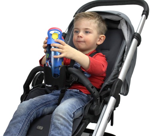 Ten uniwersalny uchwyt na kubek można łatwo przymocować do każdego wózka dziecięcego i spacerówki.