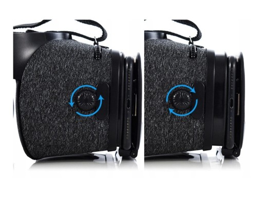 Aby uzyskać idealnie ostry obraz należy ustawić telefon w odpowiedniej pozycji. Użyj do tego pokręteł znajdujących na obudowie, którymi wyregulujesz odległość telefonu od soczewek. Na górnej części okularów umieszczone jest pokrętło służące do regulacji rozstawu soczewek względem siebie - bliżej lub dalej.