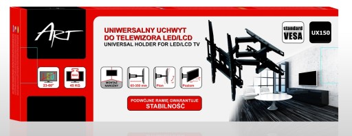 Model UX-150 to doskonały wybór dla posiadaczy dużych telewizorów o maksymalnym rozmiarze 60" i wadze do 45 kg. Odległość monitora od ściany to tylko 6,5 cm a maksymalne jego odsunięcie to aż 35 cm. Solidna, metalowa konstrukcja. Uchwyt łatwy w instalacji. Uchwyt UX-150 pozwala na zawieszenie telewizora wyposażonego w mocowanie VESA w standardach: