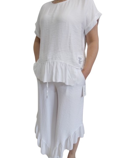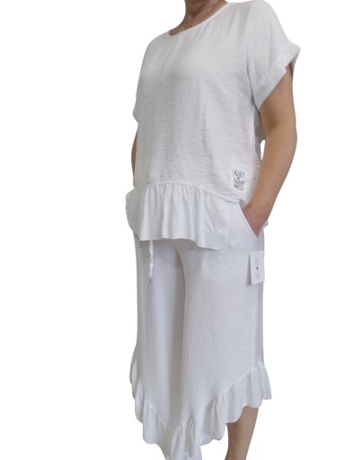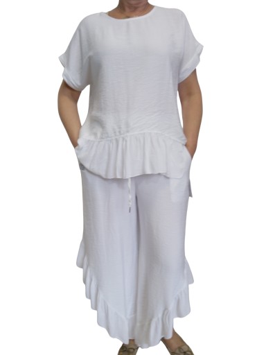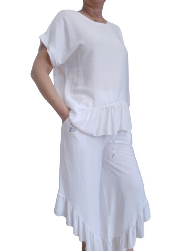 Przepiękny niespotykany komplet damski ,spodnie są szeroie zakończone falaną uszyte w skos , posiadają w pasie gumkę i sznurek, natomiast góra jest bardzo lużna zakończona z przodu falbaną przez co bardzo fajnie wygląda