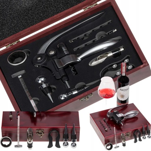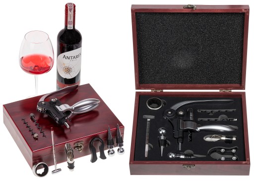 Elegancki zestaw do wina w drewnianej skrzynce.Całość zapakowana w walizkę o wymiarach: 25 x 28 x 6,5 cm.