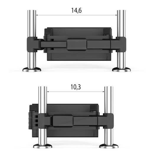 - Regulowany rozstaw ramion uchwytu: idealny do montażu na zagłówkach o rozstawie wsporników od 10,3 do 14,6 cm