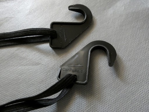 - Proste i intuicyjne mocowanie. Pokrowiec mocowany jest za pomocą gumek zakończonych plastikowymi haczykami, które należy zaczepić o felgi lub kołpaki w samochodzie