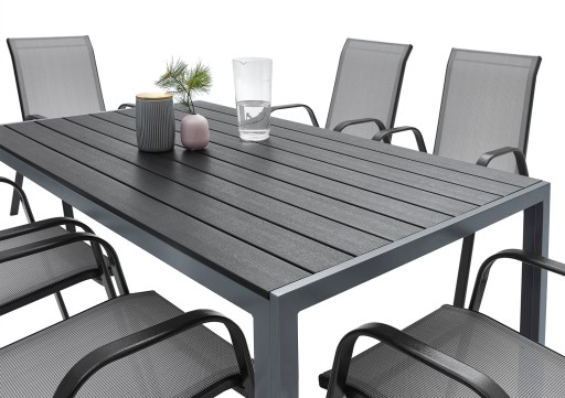 Konstrukcję stołu stanowi wysokiej jakości aluminium, malowane metodą proszkową. W oferowanym zestawie blat stołu wykonany jest z nieabsorbujących wody desek kompozytowych WPC, używanych między innymi do produkcji nowoczesnych systemów tarasowych i elewacji. Najważniejszym elementem konstrukcyjnym stołu są 4 profile aluminiowe w kształcie litery „U”. Ich zastosowanie sprawia, że po zmontowaniu całości stół jest wyjątkowo stabilny! Takie rozwiązanie pozwoliło na uzyskanie wolnej przestrzeni pod stołem i uniknąć niepotrzebnych dodatkowych konstrukcji przeszkadzających w wygodnym korzystaniu z mebli.
