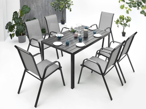 Konstrukcję stołu stanowi wysokiej jakości aluminium, malowane metodą proszkową. W oferowanym zestawie blat stołu wykonany jest z nieabsorbujących wody desek kompozytowych WPC, używanych między innymi do produkcji nowoczesnych systemów tarasowych i elewacji. Najważniejszym elementem konstrukcyjnym stołu są 4 profile aluminiowe w kształcie litery „U”. Ich zastosowanie sprawia, że po zmontowaniu całości stół jest wyjątkowo stabilny! Takie rozwiązanie pozwoliło na uzyskanie wolnej przestrzeni pod stołem i uniknąć niepotrzebnych dodatkowych konstrukcji przeszkadzających w wygodnym korzystaniu z mebli.
