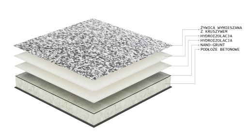 Podłoże musi być suche i czyste, bez tłuszczu i swobodnych elementów, spójne i twarde. Uszkodzony podkład (szczeliny i dziury) należy naprawić np. szpachelką wyrównującą do betonu. Podłoża chłonne należy zagruntować preparatem GRUNTUJĄCYM lub GRUNT GŁĘBOKO PENETRUJĄCY. Przygotowanie mieszanki: Jest dostarczana w proporcji 3:1 (składnik sypki : składnik płynny). Przed aplikacją należy osobno odmierzyć ilość potrzebną do każdej warstwy. Mieszankę przygotowuje się poprzez stopniowe wsypywanie suchego składnika do składnika płynnego przy ciągłym mieszaniu! Mieszanka przed użyciem musi być doskonale zhomogenizowana. W zależności od celu użycia, sposobu nanoszenia i chłonności podłoża przy pierwszej warstwie można dodać do 5% wody. Po dodaniu wody stale mieszać do momentu, gdy masa prawidłowo połączy się z wodą nabierze jednolitego ciemnoszarego koloru. Przygotowaną mieszankę należy nanieść do ok. 2 godzin (w zależności od temperatury nanoszenia) od zmieszania.