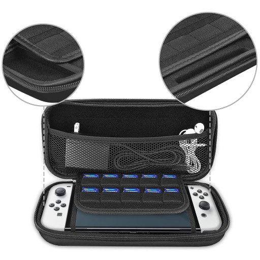 Etui jest idealnie dopasowane do Twojej konsoli Nintendo Switch i Nintendo Switch OLED - idealnie ją zabezpiecza. Wewnątrz posiada specjalne przegródki mieszczące aż 10 kartridżów z grami. W górnej części futerału znajduje się specjalne miejsce na przechowywanie akcesoriów do konsoli takich jak ładowarka, powerbank, słuchawki, pudełka z gier, itd. Pokrowiec posiada także praktyczną smycz do przenoszenia.