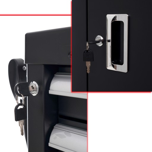 Centralny zamek z dwoma kluczami zamykający wszystkie szuflady oraz składzik zabezpieczają narzędzia przed niepożądanym dostępem lub kradzieżą, zapasowy kluczyk w zestawie w przypadku zgubienia jednej sztuki.