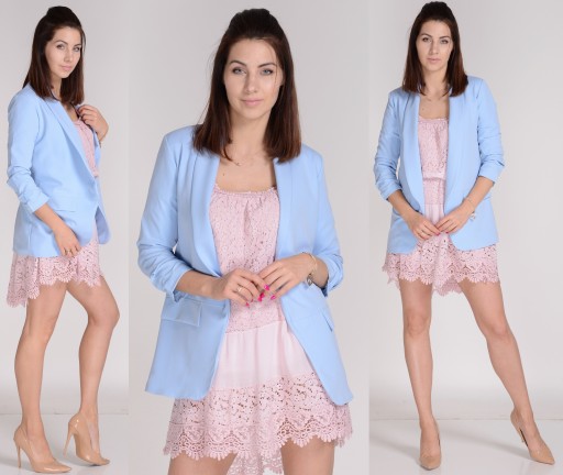 Doskonałe dopełnienie stylizacji do pracy, na uczelnie lub na wieczorne wyjście. Oryginalnego charakteru dodają drapowane rękawy o długości 3/4. Imitacja kieszonek po bokach z efektownymi klapami upiększają marynarkę. Fason luźny, z podszewką i miękkimi poduszkami w ramionach.