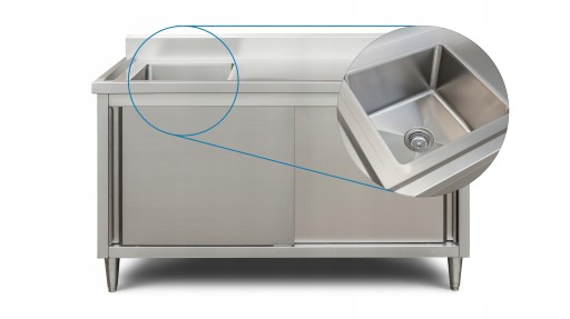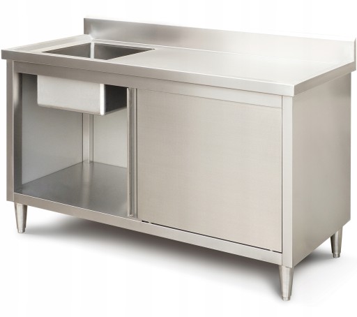Stół roboczy, zlew (basen), szafka z rantem ochronnym na ścianę, ze stali nierdzewnej kwasoodpornej INOX, zamykana drzwiami przesuwnymi, stół roboczy ze zlewem (basenem)