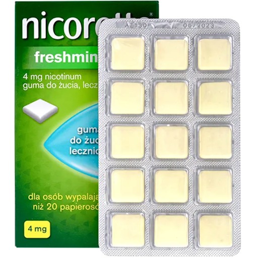 Lek Nicorette FreshMint Gum wskazany jest w leczeniu uzależnienia od wyrobów tytoniowych. Każda guma dostarcza do organizmu 4 mg nikotyny, co pozwala na zmniejszenie głodu nikotynowego i objawów odstawiennych, występujących po zaprzestaniu palenia. Nicorette FreshMint Gum jest odpowiedni dla osób o wysokim stopniu uzależnienia, palących więcej niż 20 papierosów na dobę. Lek może być stosowany do ograniczenia lub całkowitego zaprzestania palenia. Gumy do żucia Nicorette FreshMint Gum nie zawierają cukru ani składników pochodzenia zwierzęcego. Nikotyna zawarta w gumie podawana jest w czystej postaci.