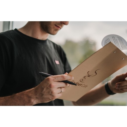 Metalowy klips porządnie spina kartki, podkładka jest dodatkowo wyposażona także w metalowe kółko, dzięki któremu można powiesić ją na stałe na ścianie, a tylko w zależności od potrzeby wymieniać w niej kartki.