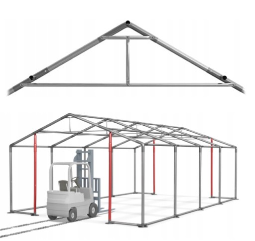 1 - Rury konstrukcyjne fi ok. 50 mm 2 - Łączniki konstrukcji fi ok. 54 mm 3 - Wzmocniona konstrukcja dachowa 4 - Mocne podwójne śruby przechodzące na wylot 5 - Wzmocnienia wjazdów 6 - Wzmocniona konstrukcja podłogowa 7 - Powiększone stopy fi 14 cm 8 - Naciągi dachowe 9 - Naciągi boczne
