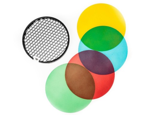 Zestaw grida, zwanego też plastrem miodu, w komplecie z filtrami barwnymi pozwala na uzyskanie ciekawych, kreatywnych efektów.