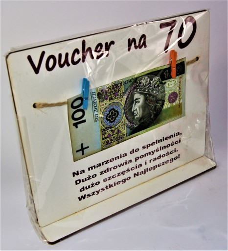 - klamerki drewniane, sznurek, koperta, podstawka umożliwiająca stabilną, pionową pozycję vouchera